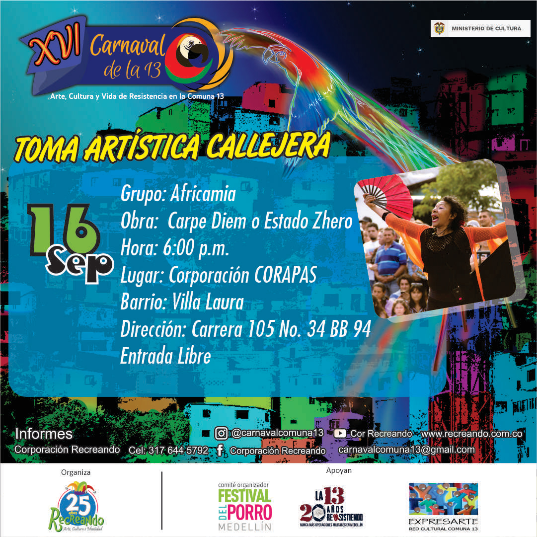 Toma artística callejera, en el marco del XVI CARNAVAL DE LA 13, evento concertado con el ministerio de cultura, grupo Africanos. Te esperamos.