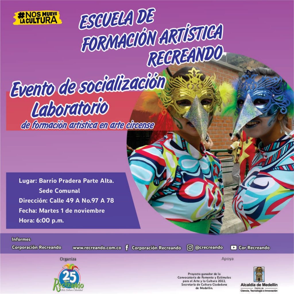 Te invitamos a la Socialización del cierre del Laboratorio de Artes Circenses de la Escuela de Formación de la Corporación Recreando, este 1 de noviembre en el barrio Pradera Parte Alta.