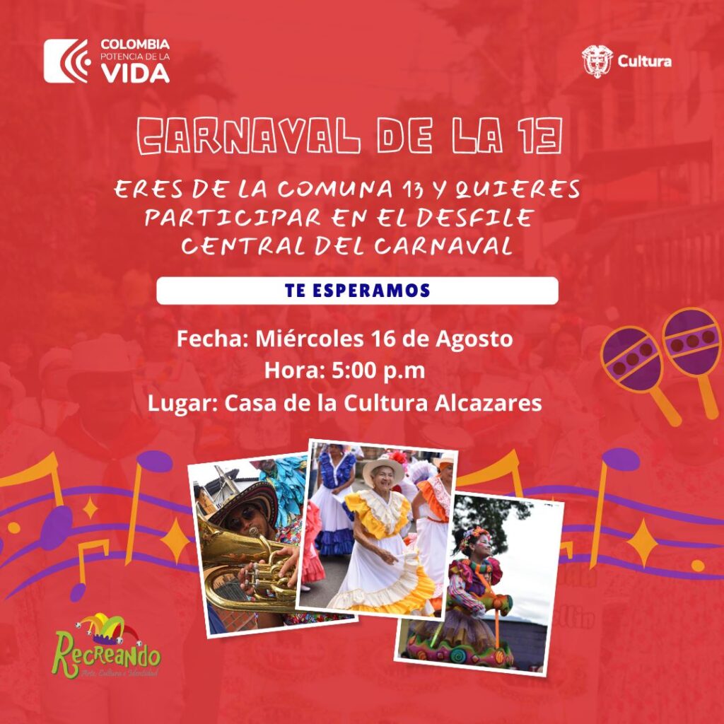 si pertenece a la Comuna 13, eres parte de un grupo de artes escénicas, te invitamos a participar de la convocatoria para participar del Desfile Central del XVII Carnaval de la 13, a realizarse el 23 de septiembre. Te esperamos el próximo miércoles 16 de agosto en la Casa de Cultura Los Alcàzares