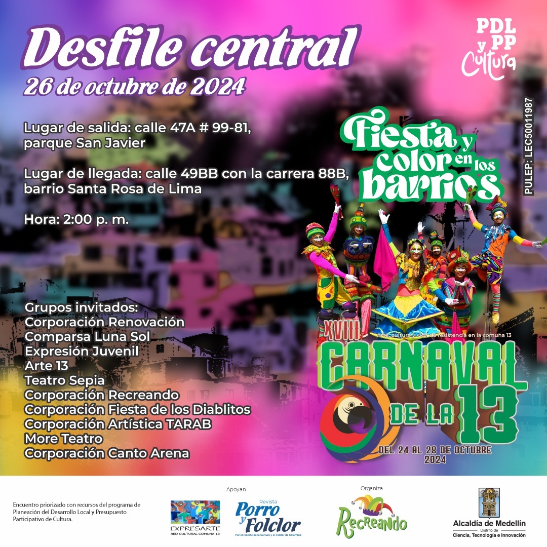 Invitación al Desfile central del XVIII Carnaval de la 13: fiesta y color en los barrios. comparsa, teatro, música y danza se toman las calles de la 13.