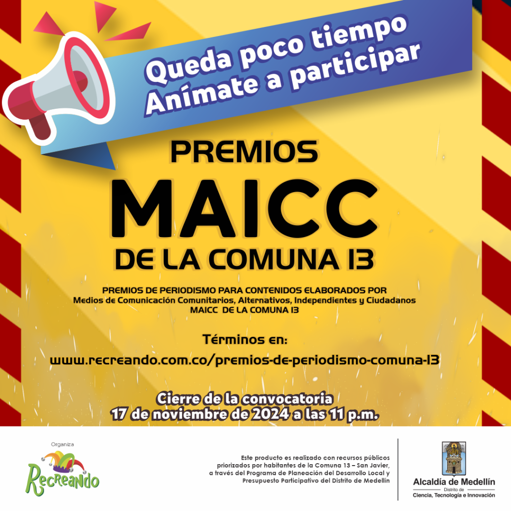 Estamos a pocos días del cierre de postular tú iniciativa comunicativa para los premios MAICC Comuna 13, un homenaje a la labor periodística que hacen en los barrios de la 13. Anímate a participar