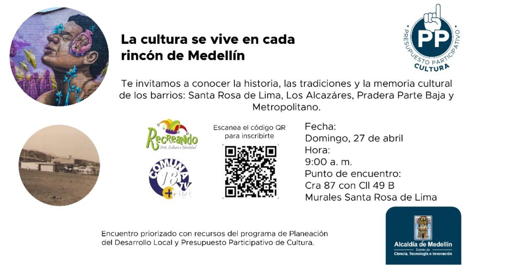 Invitación para que este 27 de abril nos acompañen al recorrido patrimonial, cultural y artístico por los barrios Santa Rosa de Lima, Pradera Parte Baja, Metropolitano y Los Alcázares. 👉🏻Debes de inscribirte al siguiente link https://docs.google.com/forms/d/e/1FAIpQLSc56kbd9qHfZecc9yMQqHcEq3sg2UyJoUFbHAwTjXnpINtu7Q/