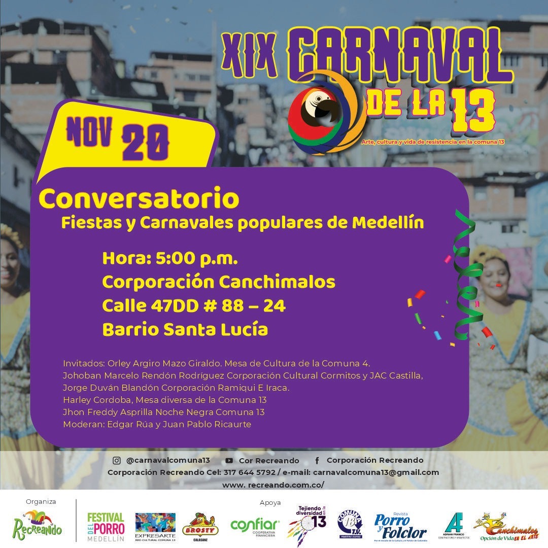 Conversatorio sobre los carnavales y fiestas populares en Medellín, un escenario de diálogo de saberes y populares en torno a la actividad artística como herramienta…